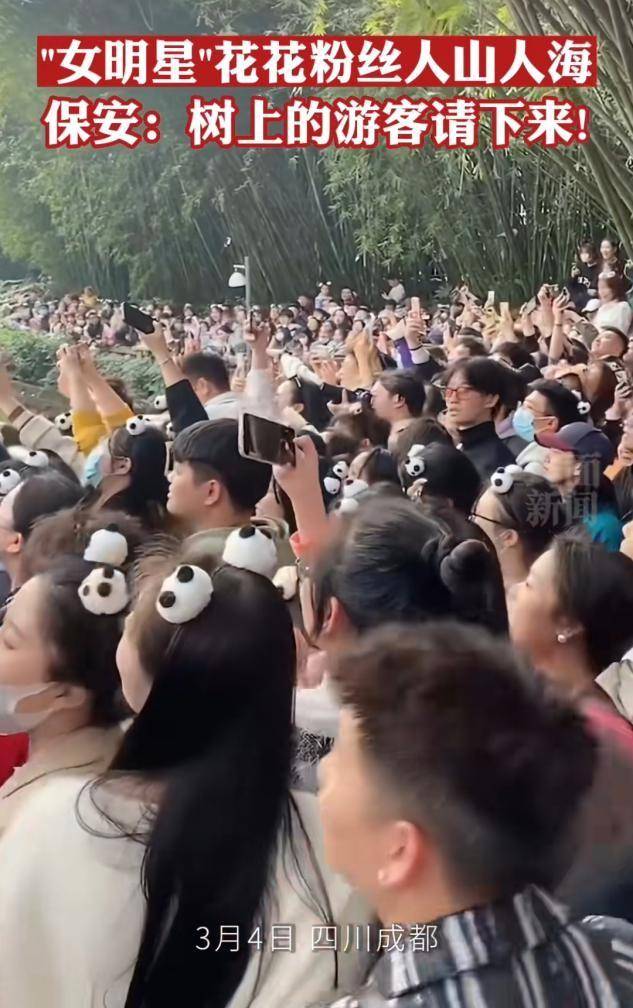 许多网友从自媒体平台了解到花花这个笨蛋美女之后,不远万里的跑到成都大熊猫繁育基地来一睹花花的芳容。因为来的游客实在太多,馆内一度人数爆满,大家争先恐后的来到花花的展区和它互动,以至于保安无奈喊话:“让后面的游客也看看花花吧,你们都看完了怎么办?”“前面的游客,走起来!”“树上的游客请下来!”大家为了看到花花,千姿百态,笑料百出。