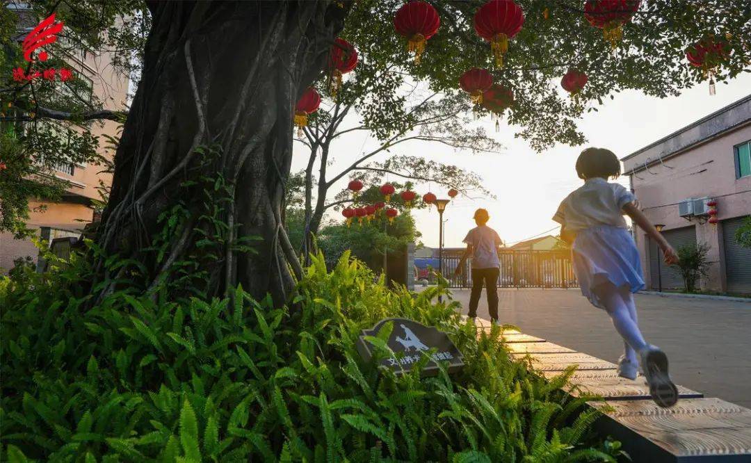 夕阳下,小朋友在村里的古榕树下嬉戏。