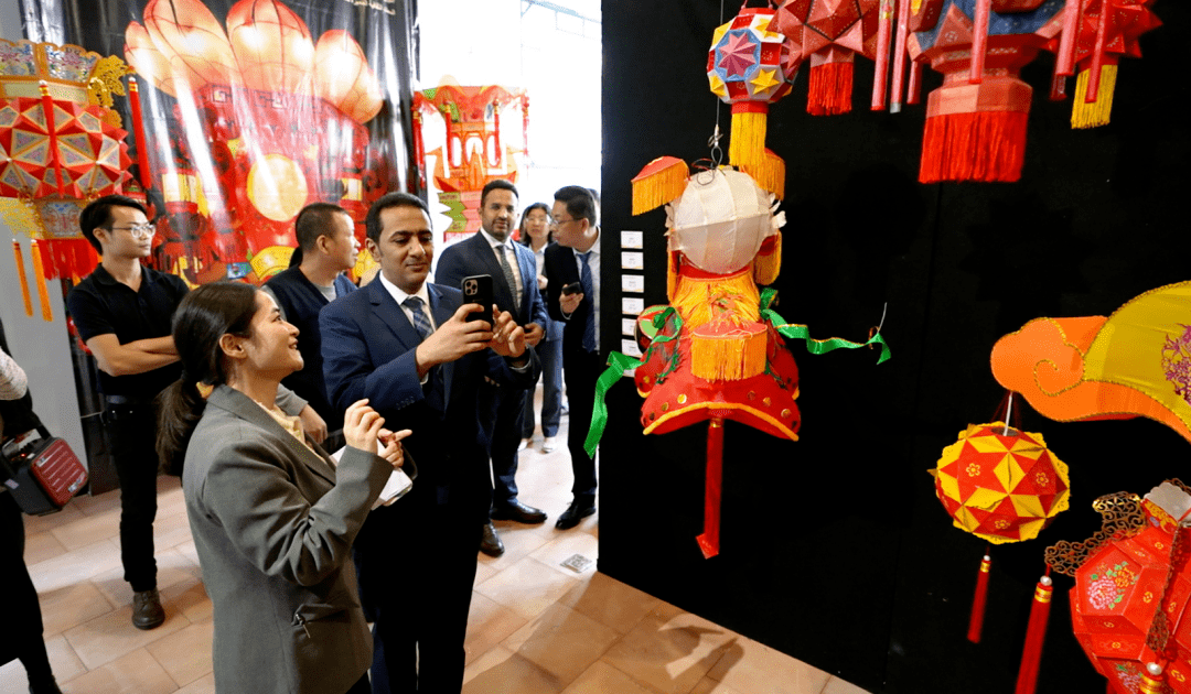 3月3日,沙特阿拉伯王国驻广州总领事阿卜杜拉·本·欧比耶等嘉宾参观“物以载道”——中国与沙特非遗数字展线下展厅。