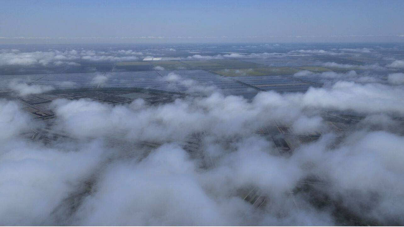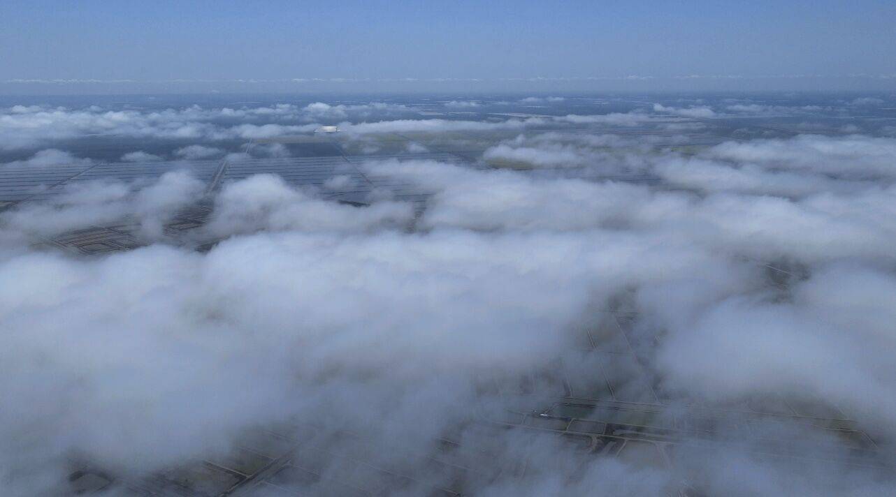 “当时,我开车来到野鹿荡周边,空气清新、视野宽阔,看到了飞翔的鸟儿、奔跑的麋鹿,还有一个个转动的风力发电机,抬头仰望,一朵朵白云连绵不断、高低起伏,云层又比较低,于是我就拿起‘小飞机’穿云航拍了。”单培泉介绍道。