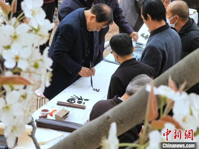 图为书法家在梨园内挥笔泼墨。 张海雯 摄