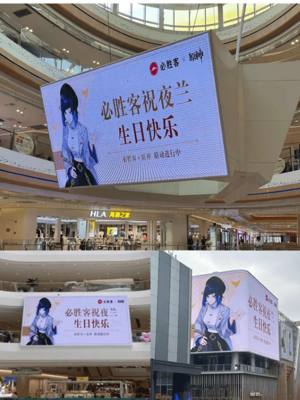 不止是商场内,各大城市商圈街道的超大广告位也都出现了夜兰的超大立绘和“生日快乐”字样,看得出必胜客真是花了一番心思。