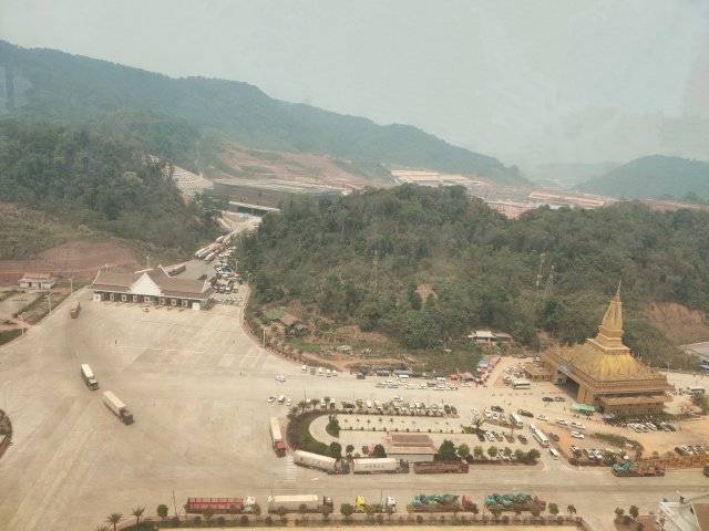 4月的炎炎烈日下,中老铁路穿过的老挝磨丁经济特区内,排队等待检查的货运车辆如长龙一般,往来不歇。从特区规划展示中心顶层远眺,正在建设中的高楼、正在铺设的路面、来往的旅游大巴、各类小店绘起这座小城的现代化雏形。