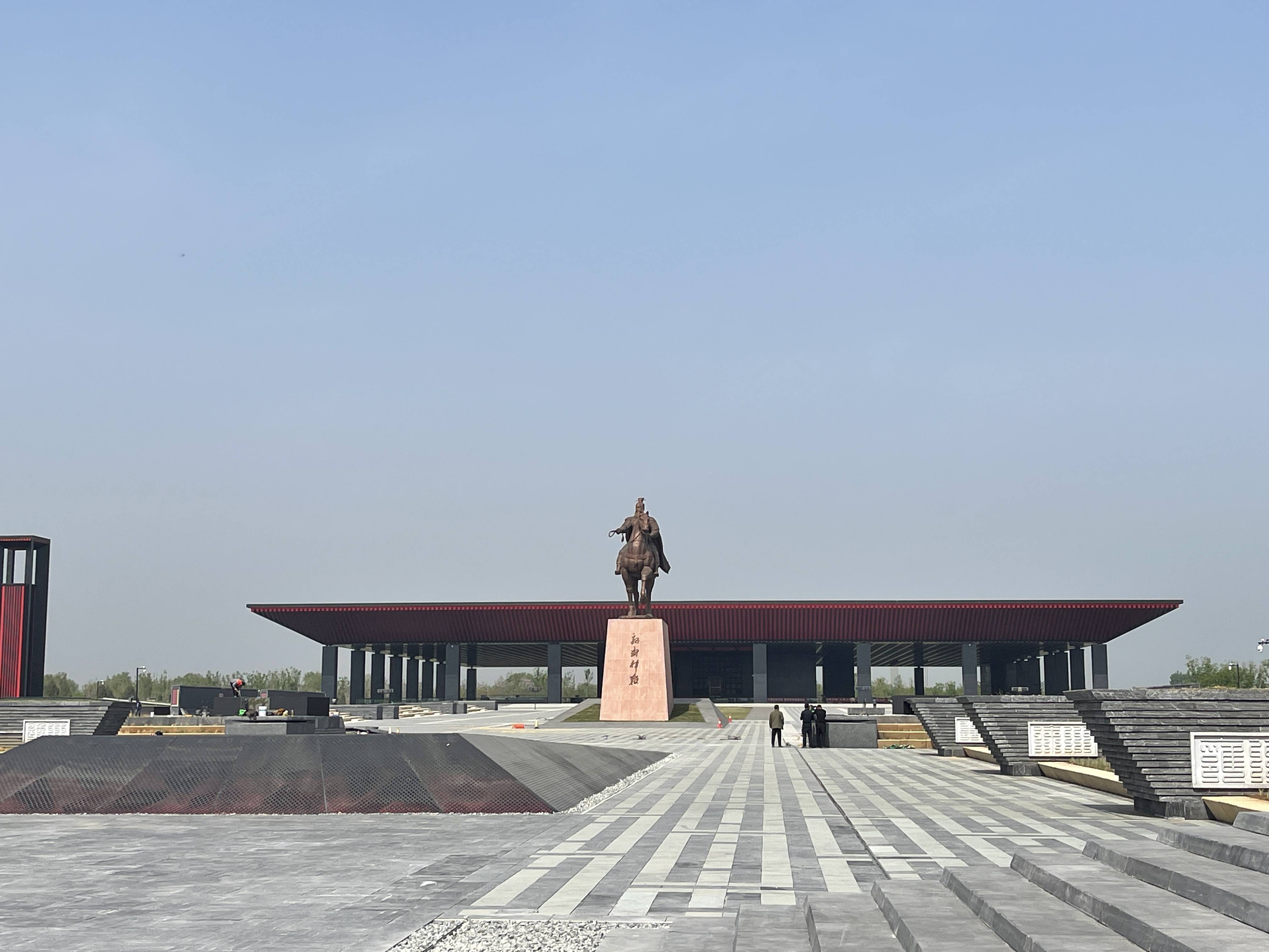 4月19日,记者出安阳市区一路向北行驶20余公里,来到曹操高陵遗址博物馆园区。周边绿化带、停车场、游客中心一应俱全。走进园区映入眼帘的是一座高15.6米的魏武挥鞭雕塑铜像,博物馆主体馆坐西朝东,黑红相间的色调看起来肃穆大气。