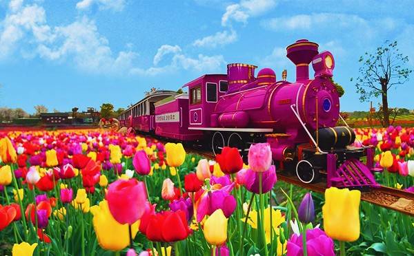 上图:武汉花博汇的旅游火车带着游客穿行在5000多亩的时令花海里。