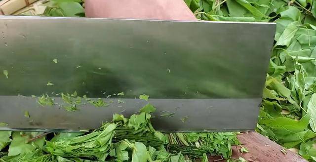 为了更快更好的把枫树叶的汁液弄出来,我们把摘下来的枫树叶子,用切把它切碎。
