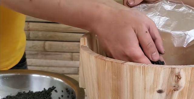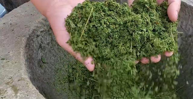 把切碎后的枫树叶子,放在对窝里面捣碎。