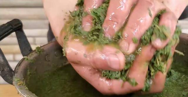 煮过的枫树叶子,用手来搓洗枫树叶子。