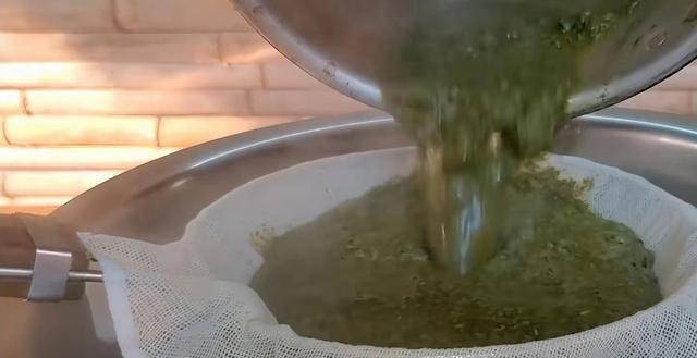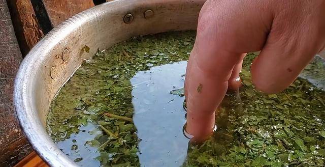 把捣碎后的枫树叶子倒入锅内煮一下,但是要控制好温度。