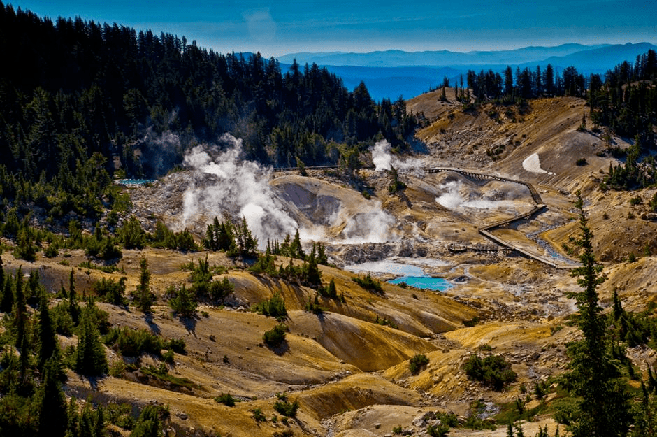 每年约有35万游客来到拉森国家公园,欣赏其超凡脱俗的景观,包括热气腾腾的喷气孔、热液湖和泥池。这个动态区域有四种不同类型的火山:复合火山、盾状火山、塞状火山和渣锥火山。这里最近一次引人注目的火山喷发发生在1914年至1915年之间,当时拉森峰喷出的火山灰高达9144米,而融化的雪导致了48公里外的洪水和泥石流。