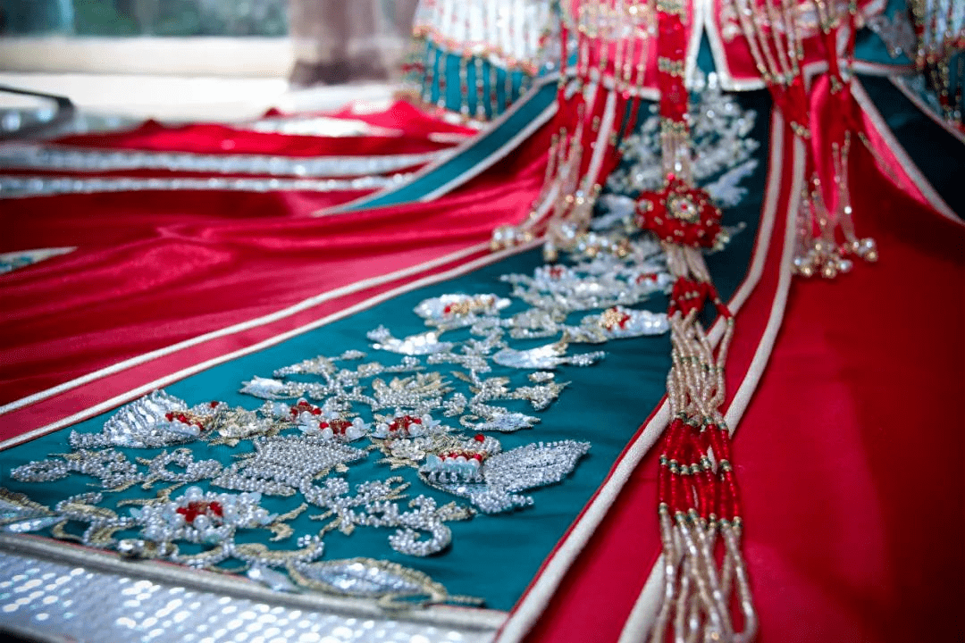 “越罗衫袂迎春风,玉刻麒麟腰带红”,新人身着宽袍大袖的宋制礼服谨遵宋式礼仪,在赞礼官带领下,完成拜堂、沃盥、对席、同牢、合卺、执手礼等传统仪式,为各自许下爱情承诺,结成了百年之好。