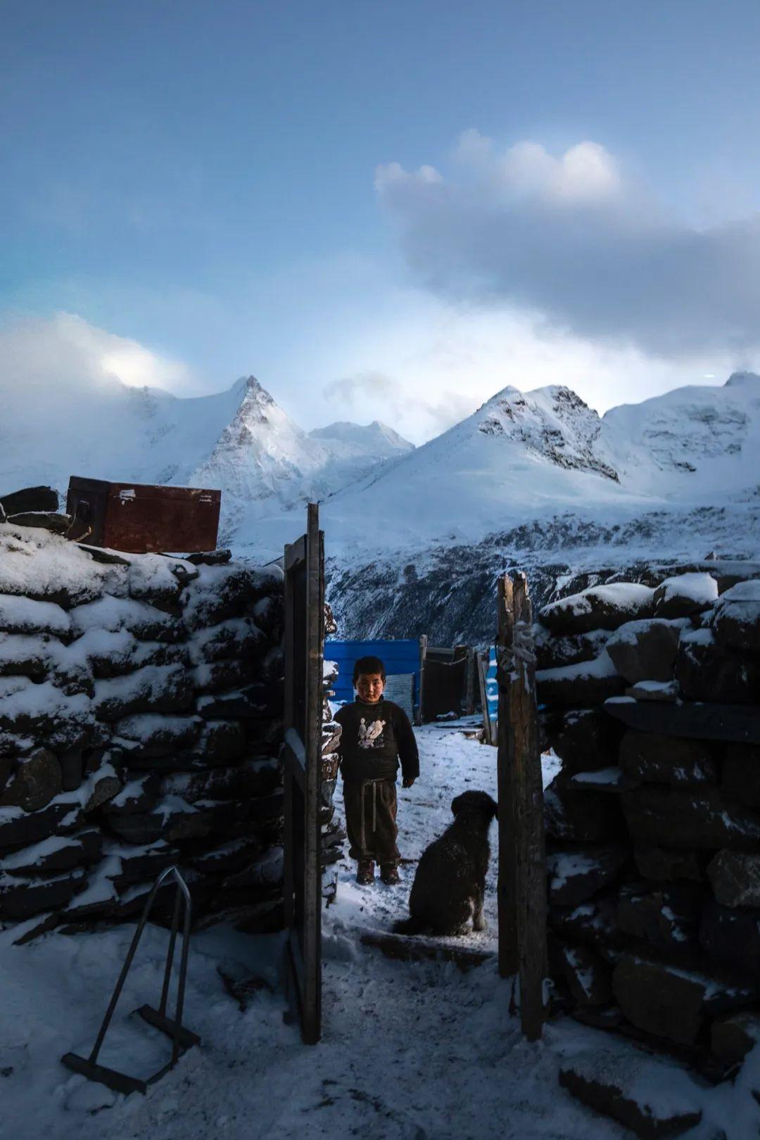 这张照片是在萨普神山前的一个民宿拍的,看过直播的朋友对这个场景很熟悉。小孩站在门前,小狗坐在门前看着小主人,背景是萨普神山。拍照的时候已经是晚上9点左右了。但是天空还有太阳落山后的余晖,加上雪景反光很强。在拍摄时,看到小孩的脸上的光线,远处雪山顶的明暗变化,还有色彩的冷暖的变化,它们构成了画面的关系。