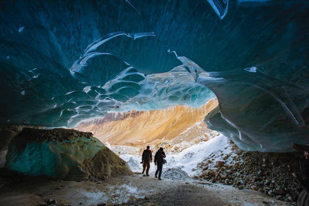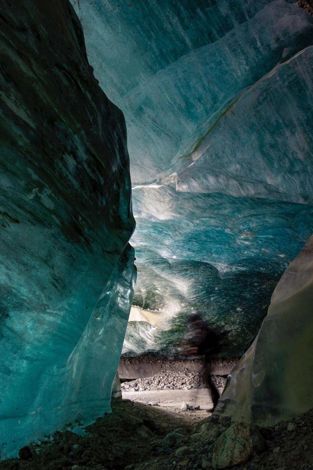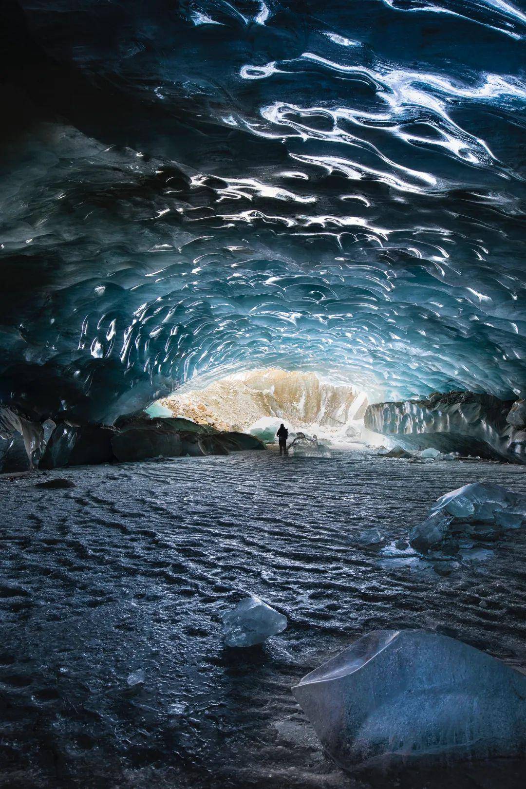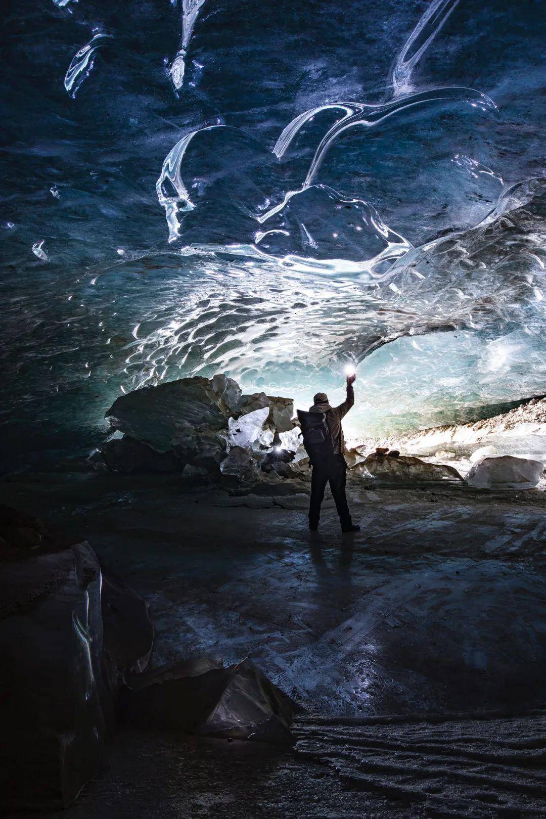 在进到这个蓝冰洞的时候,很震撼,但很快就会发现,并不好拍。我在这个洞里来回走动,从色彩、灯光上去考虑画面构图。拍摄了几张仍不满意,最后发现里面很多冰块很容易移动(因为地面也是冰很滑),于是就在里面移动大小冰块来当前景。结合光线和人物的关系来考虑画面,慢慢进入拍摄状态。