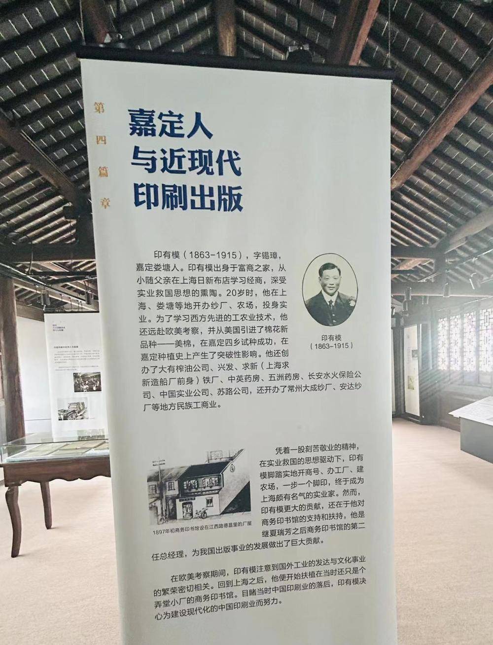 印氏住宅及其相邻的印家住宅,记录了出身嘉定娄塘古镇的一位文化名人与中国出版印刷业的故事。走上我嘉书房(工业区·印氏住宅)二楼,在与中国近现代新闻出版博物馆合作的常设展——“印行天下”印刷出版主题展里,就能了解这段故事。印家住宅的“主人”印有模生于1863年,在富国强兵、实业救国的思想驱动下,开商号、办工厂、建农场,成为上海有名的实业家。印有模更大的贡献在于对商务印书馆的支持和扶持,他是继夏瑞芳之后商务印书馆第二任总经理。