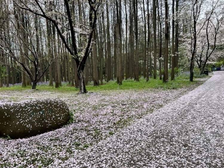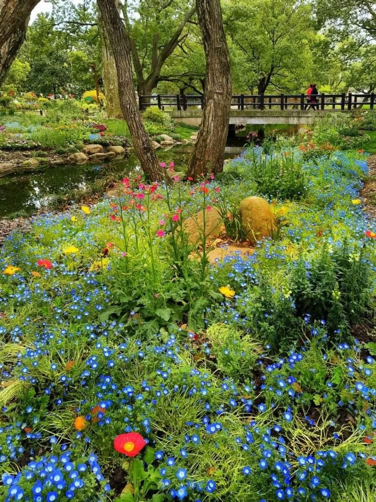 自然野趣,绿色森林……漫步在共青森林公园花艺馆南侧河岸,冰岛丽春、喜林草、香雪球、羽扇豆等数十种森林草花馥郁芬芳。