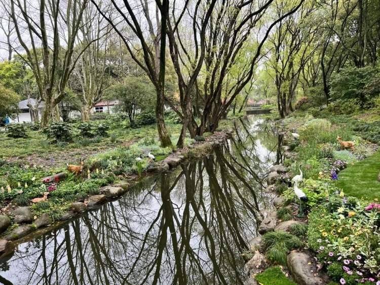 主题景点“梦浣花溪”以公园自然的水环境为依托,在河岸两边设置很多卡通装置,与野花相映成趣。精美花境与河面花艺装置形成五彩斑斓的沿岸花溪世界,加上河面倒映着的古树森林美景,令人感觉置身于人间仙境之中。同时,百花展以公园自然生长的乔灌木为依托,营造了“花语森林”“锦绣花颜”等特色景点。