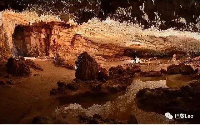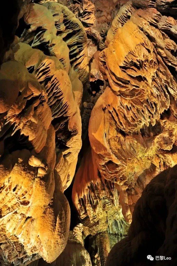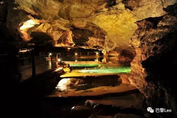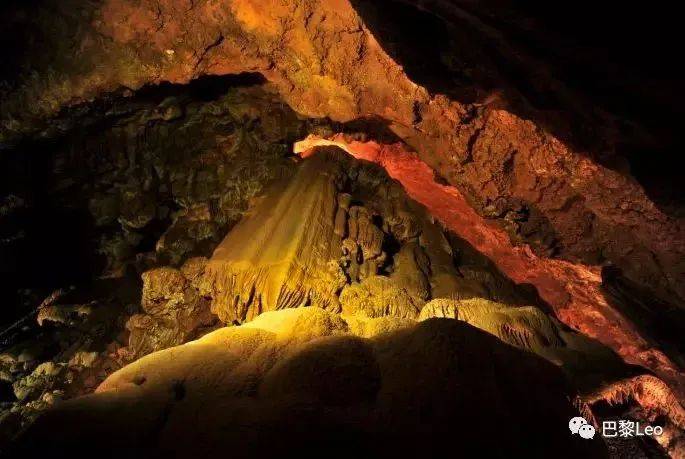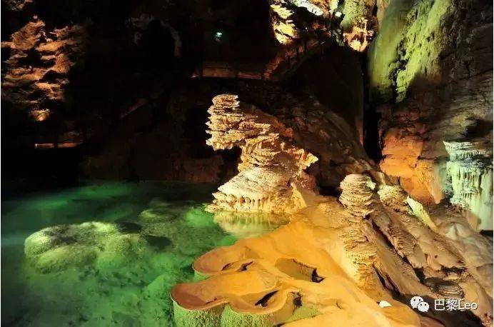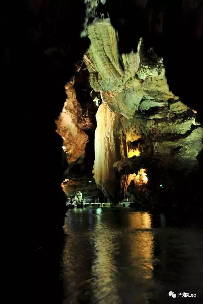 沿着洞穴下去,会发现这地下还有另外一个世界,整个地下都是空的,一条暗河驶于其中,暗河平缓,似乎难以闻到流水的声音,灯光所至之处,各种形状的巨大岩石或悬于头上,或立于身旁。