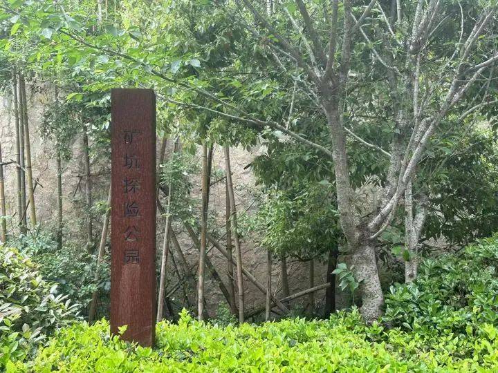 沿着内部道路,很顺利就找到了矿坑探险公园,木牌竖立在树木之间。进入公园先下后上,小道旁是环绕型的茂林修竹,深深浅浅的竹影洒在小道上,环境十分静谧。拾阶而上,就能看到平台上的“大草坪”。