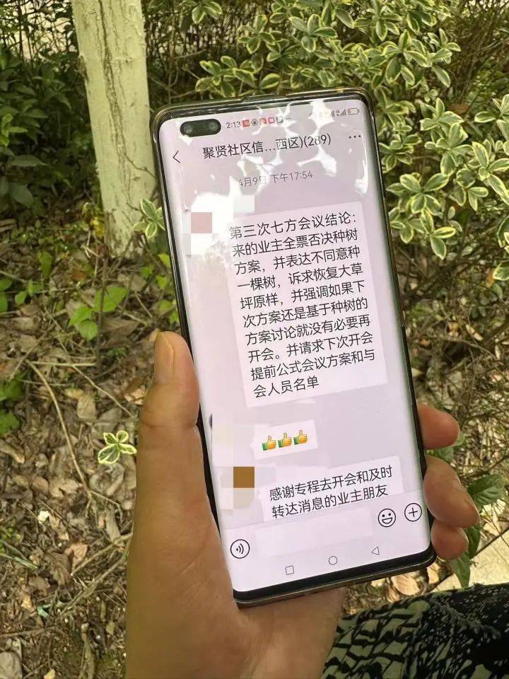 “只是知道这个事情引起了很多居民的不满,大家聚集起来抗议,听说挖草坪为了种树,但是我们不需要树了,小区里面树很多,我们缺的是草坪。”一位宝妈说,她住在七贤郡小区,3月中下旬,业主群里就弹出很多关于草坪事件的发言。七贤郡西区,七贤郡东区,竹径云山一期和二期,锦云坊,缦云坊和沿山居等小区居民联系起来,进行抗议。