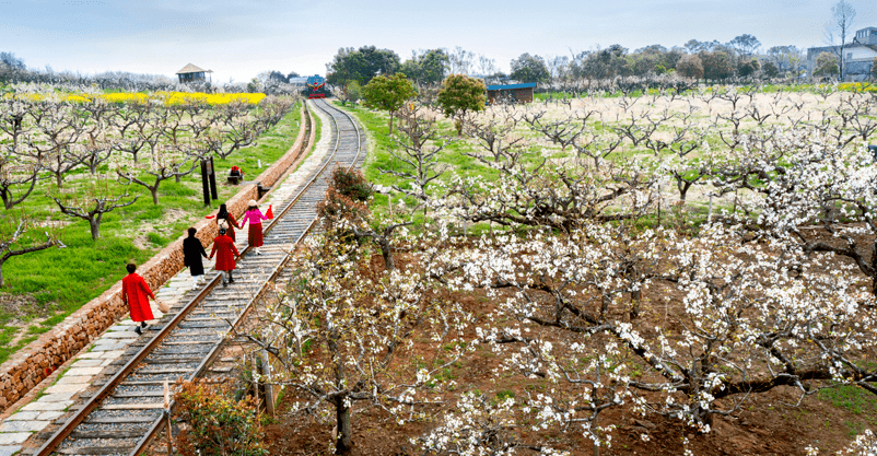 健康徒步线:蒲塘堰水库→铁轨步道→芝麻滩梨园→时光列车书吧→棠梨树→清野茶园→四季花海