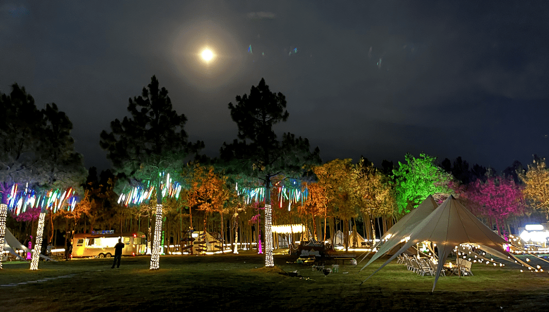 浪漫夜游线:蕻野纪营地→园林场村→铁轨步道→时光列车书吧→芝麻滩梨园→登山步道→玻璃观景台