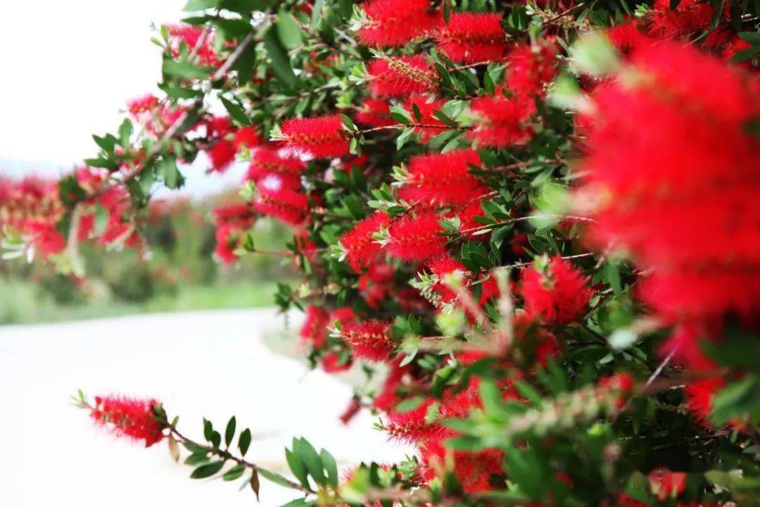 近日,恭城镇古城村一处健康骑行道两旁的红瓶刷(又名红千层)花开正艳,当天气晴好时吸引不少群众前去拍短视频及观赏、打卡。据了解,红瓶刷又称红千层、瓶刷子树、金宝树等,为桃金娘科的常绿灌木或小乔木,红瓶刷属阳性树种,喜温暖、湿润气候。