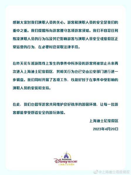 针对4月19日下午上海迪士尼乐园发生的不和谐一幕,上海迪士尼度假区官方20日上午已经予以正式回应称:“游客和演职人员的安全是我们的重中之重。我们提醒所有游客遵守各项游客须知。我们不容忍任何欺凌演职人员的行为以及其它影响游客与演职人员安全或度假区正常运营的行为,在必要时会采取法律手段。在昨天花车巡游路线上发生的事件中所涉及的游客将被禁止未来再次进入上海迪士尼度假区,其相关行为也已交由公安部门进行进一步调查。我们同时开展了各项工作,以做好对于在事件中受影响的演职人员的安抚和支持。”