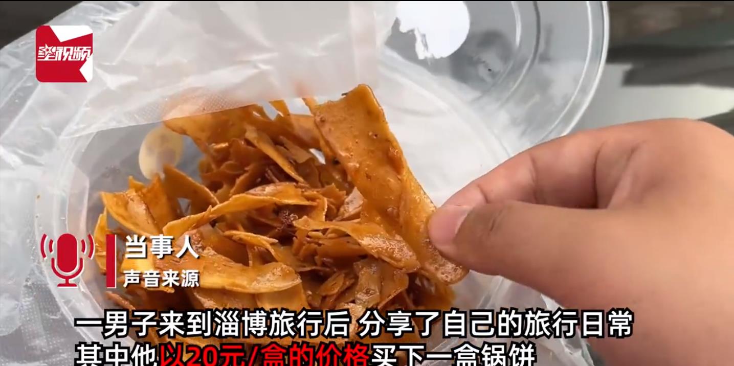 近日,一男子到山东淄博旅游,偶遇流动商贩贩卖当地小吃,于是花20元钱买了一盒“锅饼”。男子不但拍下了购买的视频,同时也分享了品尝的视频。第二天,男子接着在淄博游玩,逛到“八大局”才发现,原来自己花20元买的那盒锅饼,实际价格只要6元左右。