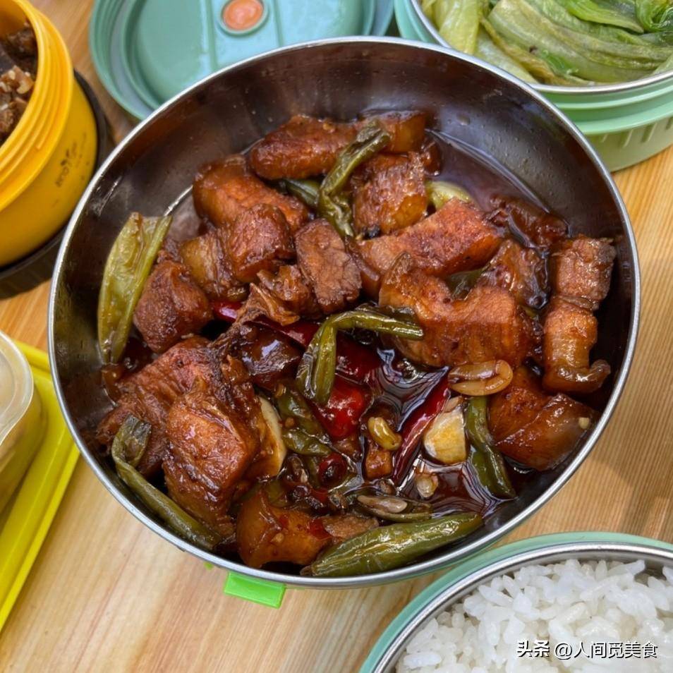 今天时间充裕,曹大姐还准备了昨晚吃剩的花生猪蹄汤,还另外蒸了一条美味的鱼,这样凑齐了五道菜,看着就丰富,让不少同学羡慕不已。曹大姐的儿子不挑食,但是爱吃肉,所以这一顿就是主打一个红烧肉,这个红烧肉看着就诱人,五花肉肥瘦相间肥肉少瘦肉多,小孩子吃起来不会腻,还和豆角泡椒大蒜一起翻炒一下,这样更油润可口。
