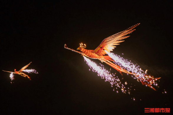 7米翼展火凤凰腾飞在铜官窑上空,“五一”假期每天都有一场火凤飞舞的表演,还有绝美千年非遗绝技“打铁花”与之相互呼应,高达1500℃的铁水流星在你眼前散落,给你手可摘星辰的震撼。