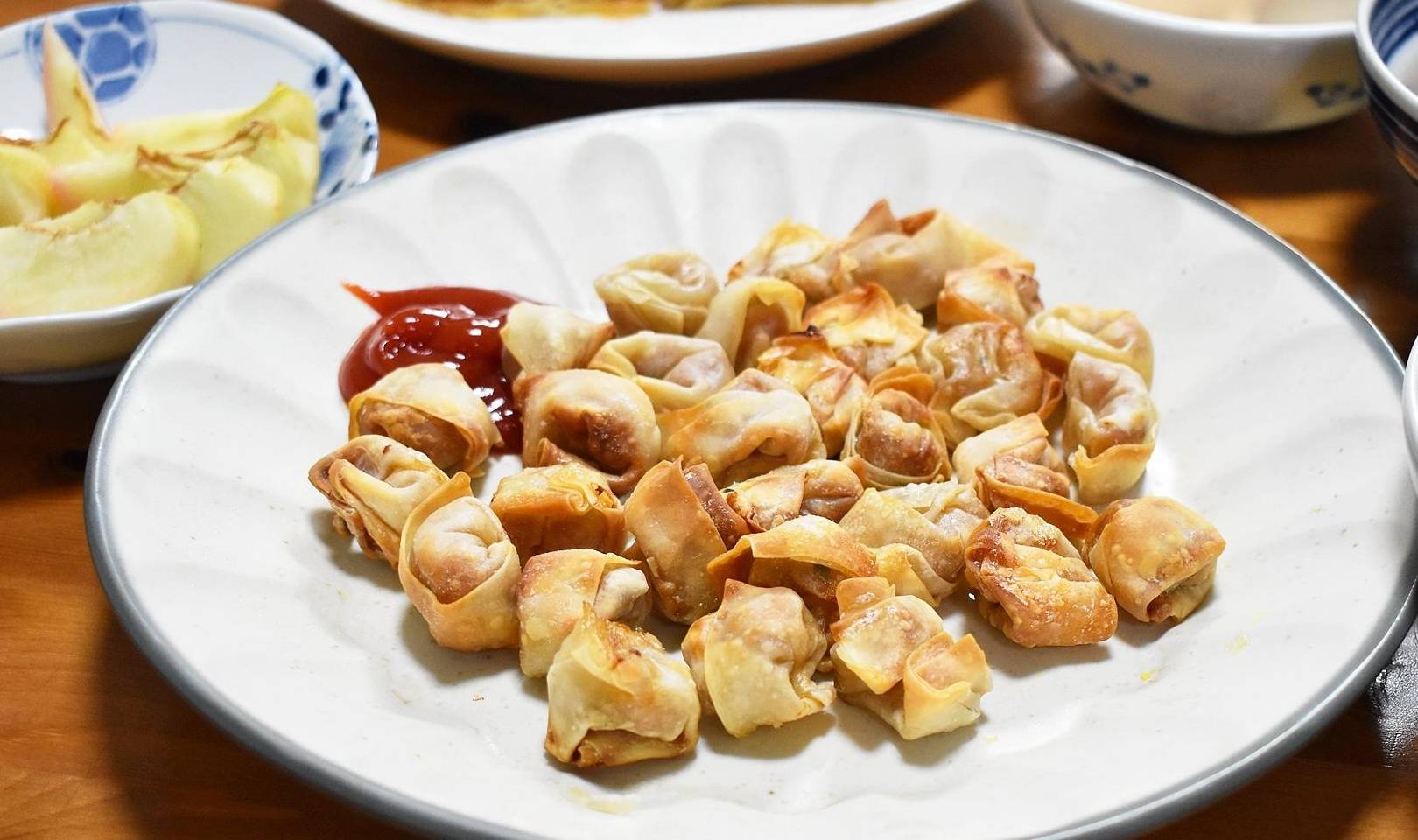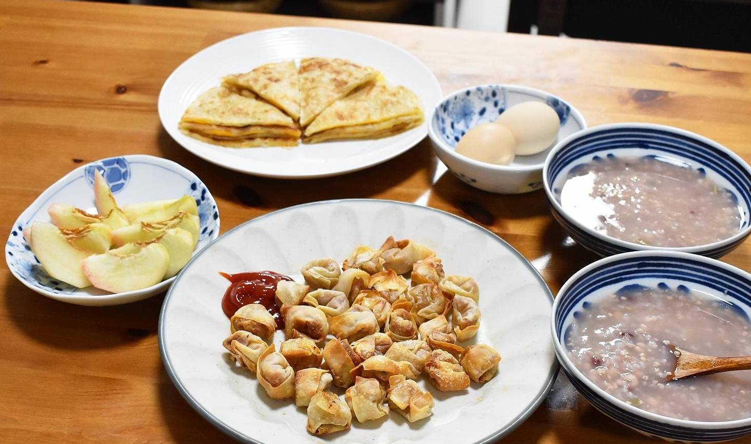我花了不足20分钟就做好这桌营养早餐,早餐分别有炸云吞、煎蛋饼、红豆薏米粥、水蜜桃和水煮鸡蛋。