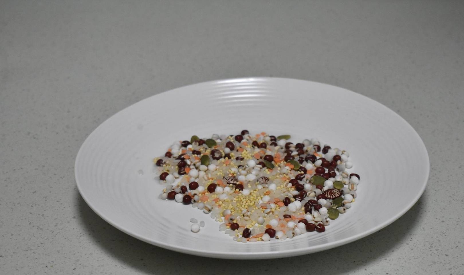 我用了袋装红豆薏米粥配料,食材挺丰富,有红豆、薏米、小米、大米、干胡萝卜粒、西米、南瓜籽等,一袋红豆薏米粥全部食材的分量50克。