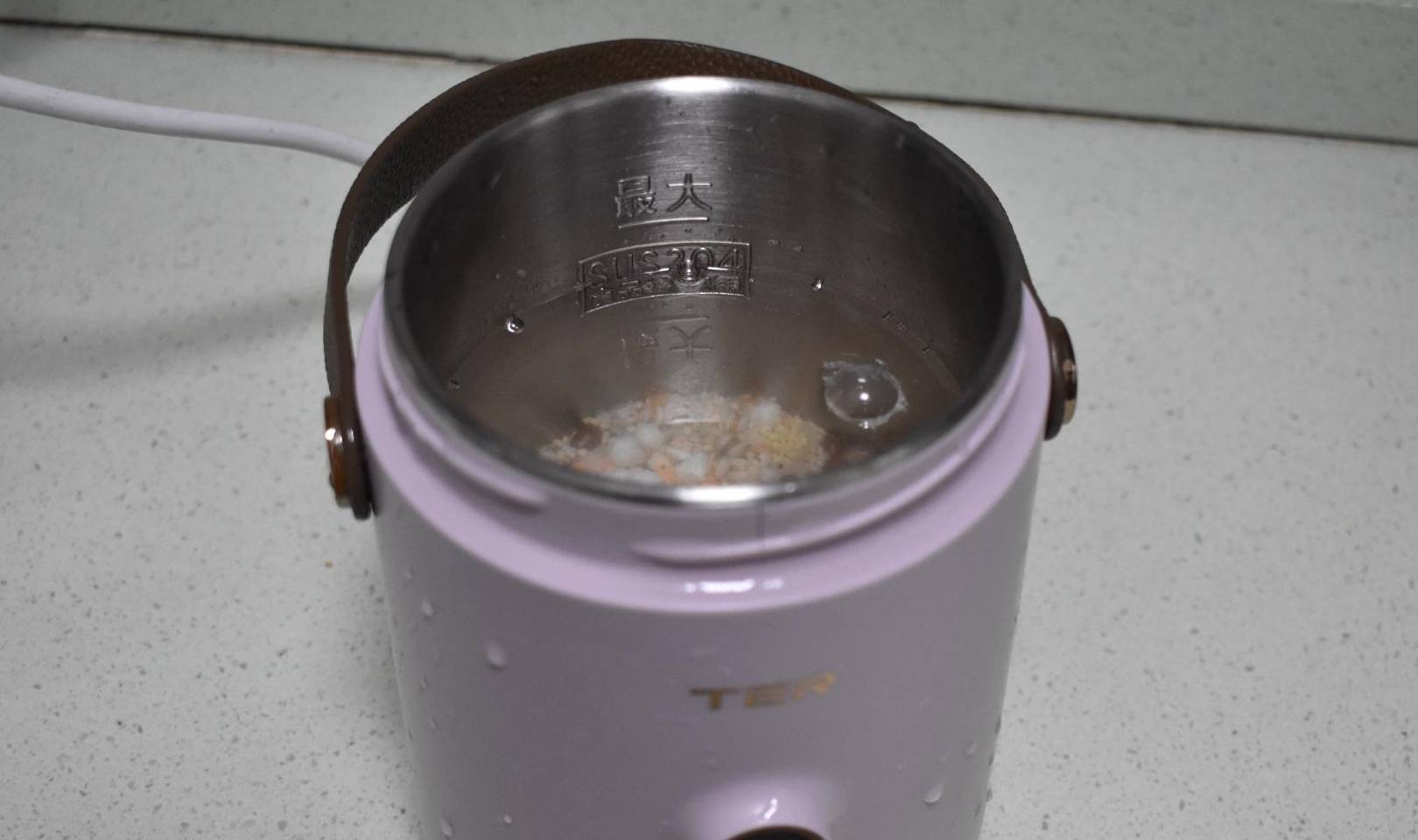 我把全部食材清洗干净,放入多功能煮锅,按下炖煮预约功能键。这个煮锅最大容量650毫升,家里只有我丈夫和我两个人,煲太多粥吃不完放着不新鲜,红豆薏米粥煮好后刚好两碗。
