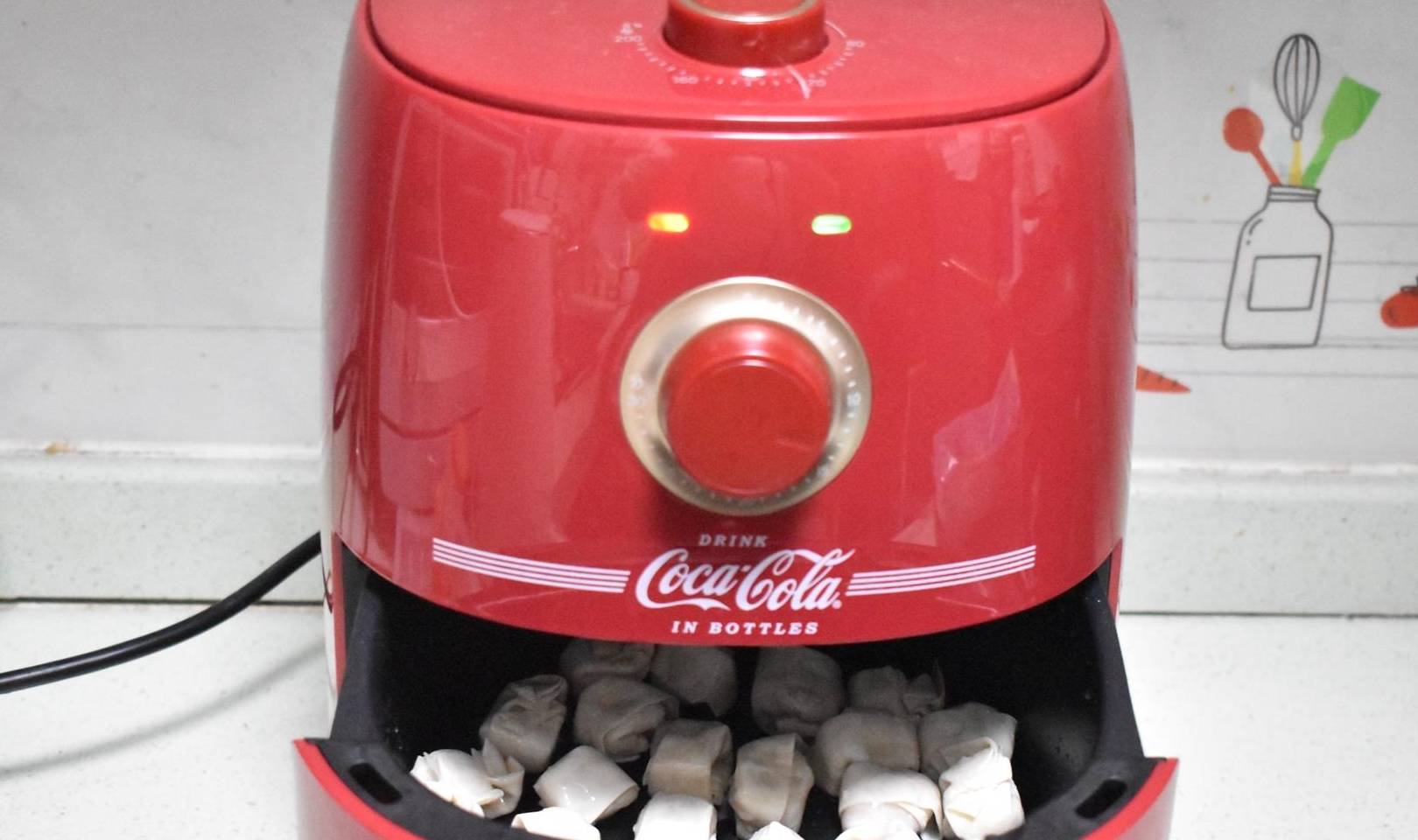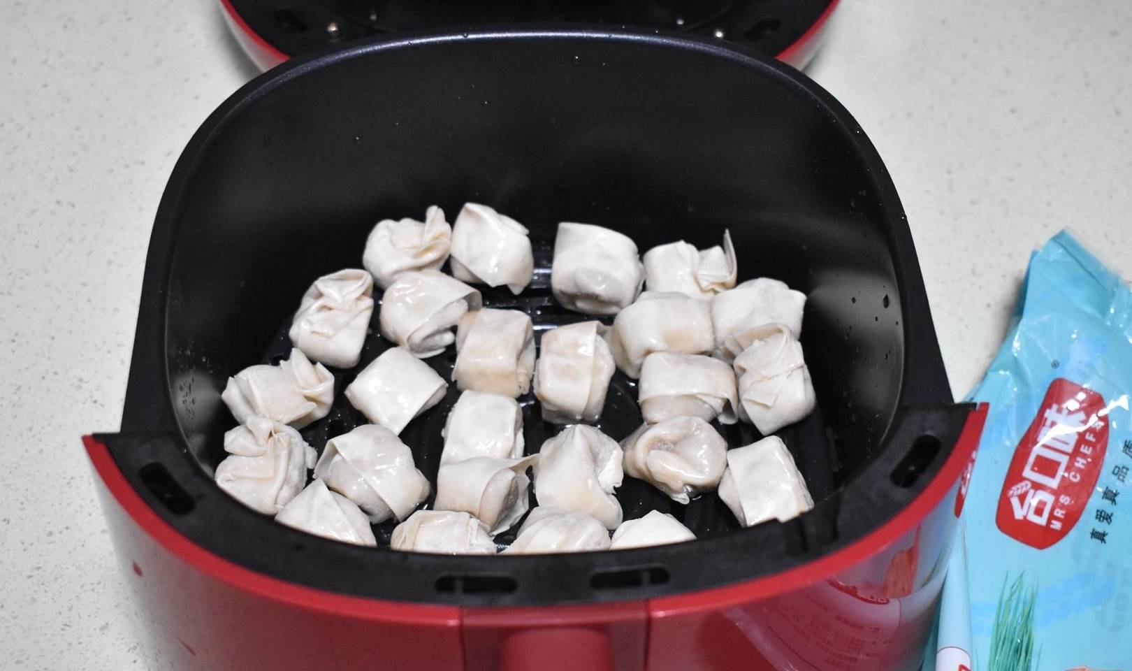 在广东,云吞除了水煮还可以油炸,不过我不想用油炸,改成用空气炸锅炸云吞,不用油可以多吃几个炸云吞。我用油刷了空气炸锅的不粘盘,每一只鲜虾云吞表面刷一层油,空气炸锅调180度设置烘烤15分钟。