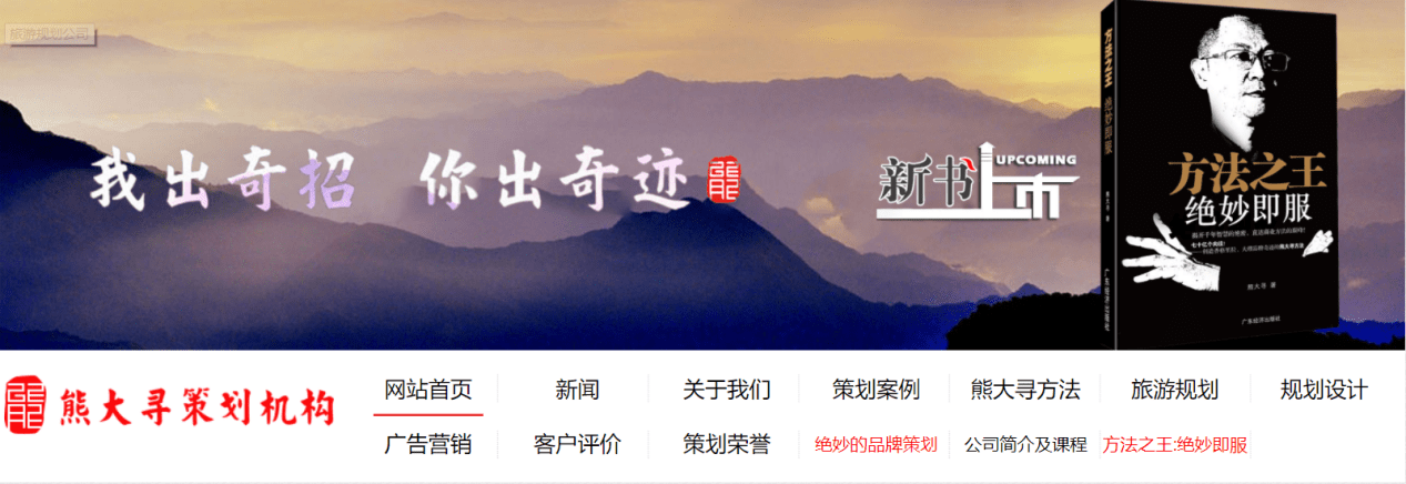 还有一个原因,近年来,熊大寻旅游规划公司力推自己的核心方法论——绝妙即服。大量举例品牌口号、广告语,这也让同行找到了安慰,熊大寻牛吧,是的!但他只在广告语上牛。其实,我们每个项目都进行整体策划和规划,整体策划包括形象概念策划、产品策划和营销策划。其中,产品策划我们必须包含震撼性产品策划,一定要创意核弹级的景观、产品。一个策划方案不涉及项目的方方面面,是不行的。我们有一个原则:熊大寻旅游策划公司经手的项目,一定要发现世界奇观,如果没有,就去创造。企业品牌策划,除了广告语,我们同样要改造、提升它的产品和营销。