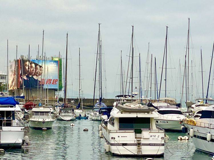 香港维多利亚港口,鳞次栉比的船只背后,一幅巨型保险广告上面写着三个字:赢得起/本文作者拍摄