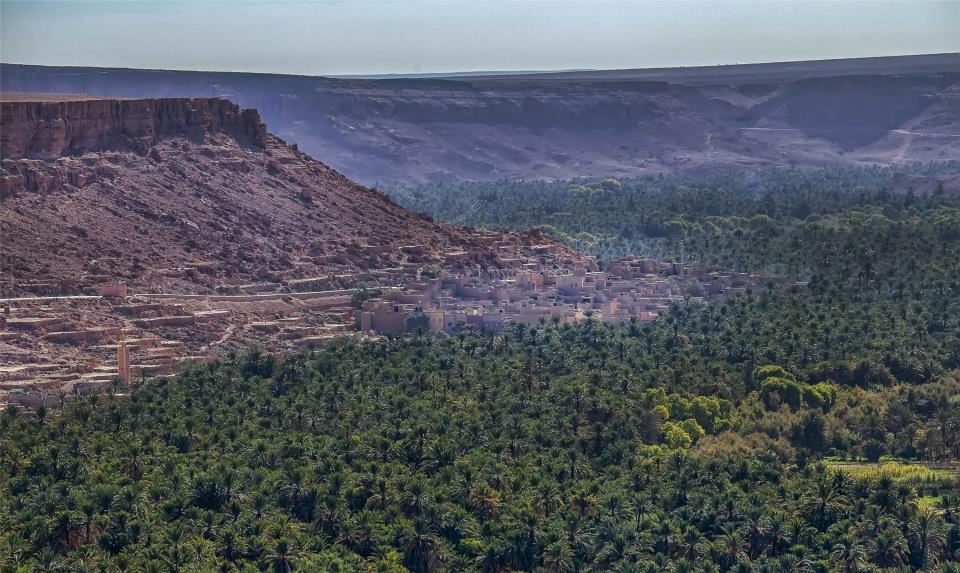 济兹河河谷绿洲靠着微弱的降水以及谷底孱弱的小河,哺育着数万人口和绵延几十公里的椰枣林,林间还开垦有农田,人们为了保护绿植,涵养水源,全都靠在崖边密集建造如同堡垒般的屋舍,清真寺那高高的宣礼塔依然是黄绿之中最醒目的建筑。