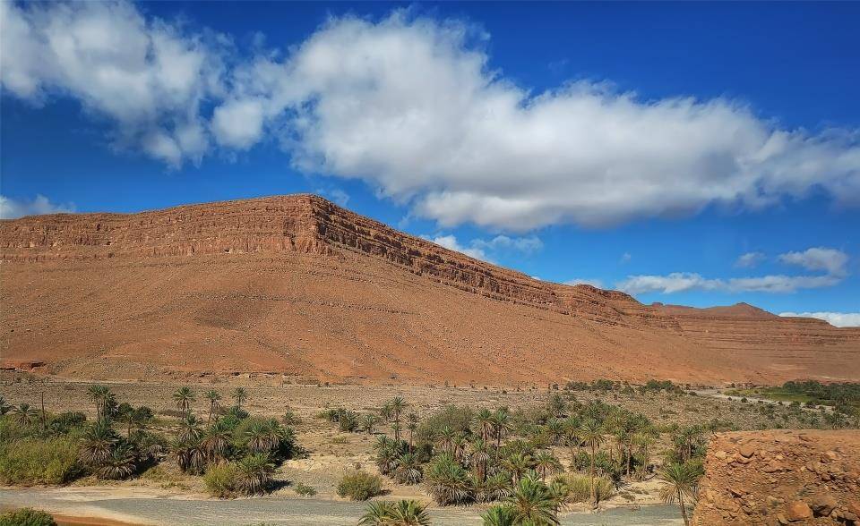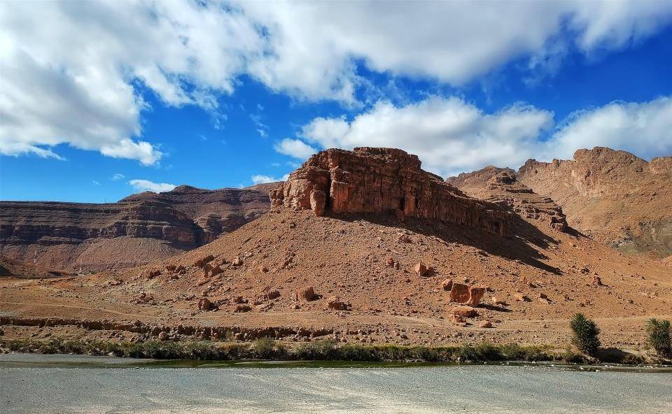 车辆疾驰在N13公路上,可以清楚地看到济兹河俨然成为撒哈拉沙漠与阿特拉斯山脉的分界线,河西是赭红色的砂岩山体,数亿年前非洲板块与欧亚板块相撞击产生的褶皱纹理清晰可辨,风化崩塌的巨石滚落在河岸边,尽显岁月沧桑!