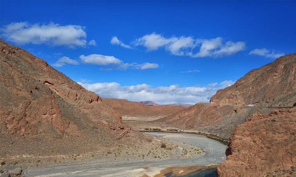 顺着济兹河逆流而上,在河水劈开阿特拉斯山的峡谷口处,断断续续的水流倒映着蓝天白云,开始出现完整的流淌模样,不过山区里的河岸两旁由于土地的贫瘠依然保持着火星一般的原始洪荒。