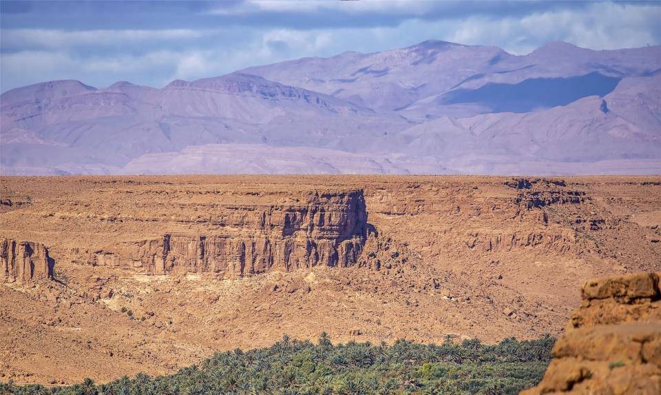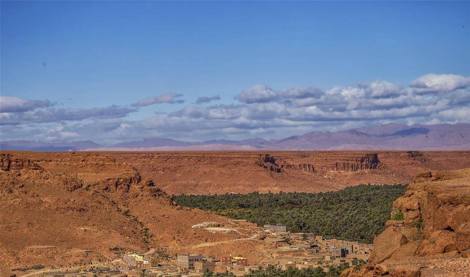 作为阿特拉斯山东南部的抬升部分,紫青色的阿特拉斯山横亘在天际,而济兹河河谷绿洲就如同广袤的红土高原中的一条细缝,谷底的绿洲和村落如果不走到悬崖边时根本看不出的,它就如同一朵让人欣喜的生命之花悄然绽放于荒凉的峡谷,不争不妒!