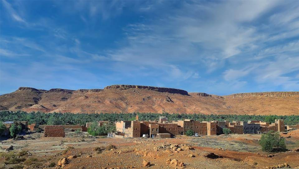 沙漠日出观赏完毕,离开沙漠小镇梅祖卡已经是上午九点了。车子沿着撒哈拉沙漠的边缘,循着N13公路一路向北,荒凉的戈壁满眼皆是赤红土黄,数十公里路程后,路边间或闪过一些部分废弃但仍有人居住的小村落。