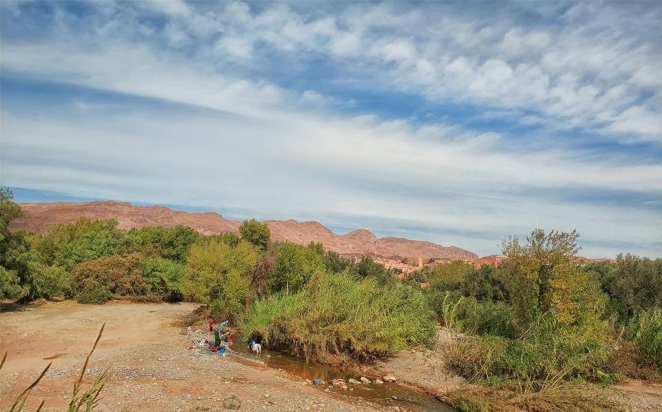 作为地球上最干旱的地方之一,一条发源于阿特拉斯山的内流河济兹河经过长途跋涉,流到接近撒哈拉的时候,已成断断续续的干涸河床,它沿途滋养了无数绿洲挣扎到此,尚有一泓清浅的溪沟供村民们饮用洗衣也确属不易了!