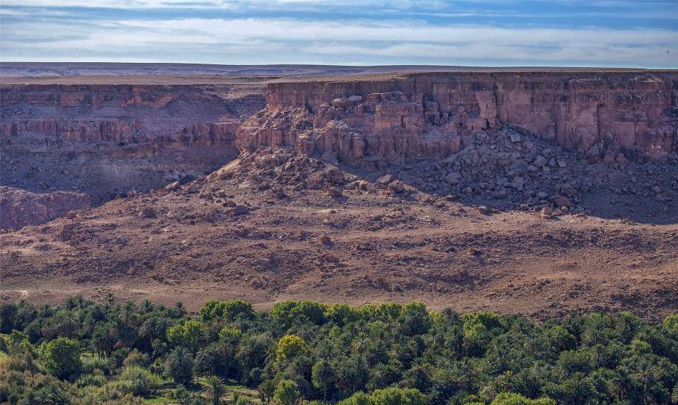 撒哈拉确实有它奇妙独到的风情,济兹河顺着阿特拉斯山的山势走向蜿蜒萦回,河水的冲刷以及风沙的侵蚀,使得地处广袤沙漠边缘的阿特拉斯山上升台地呈现出一种酷似美国亚利桑那州大峡谷周边的地形地貌!平整的高台被河水深切形成陡立的崖壁,而宽阔的河床上则有丛丛簇簇的绿色植物恣意生长。