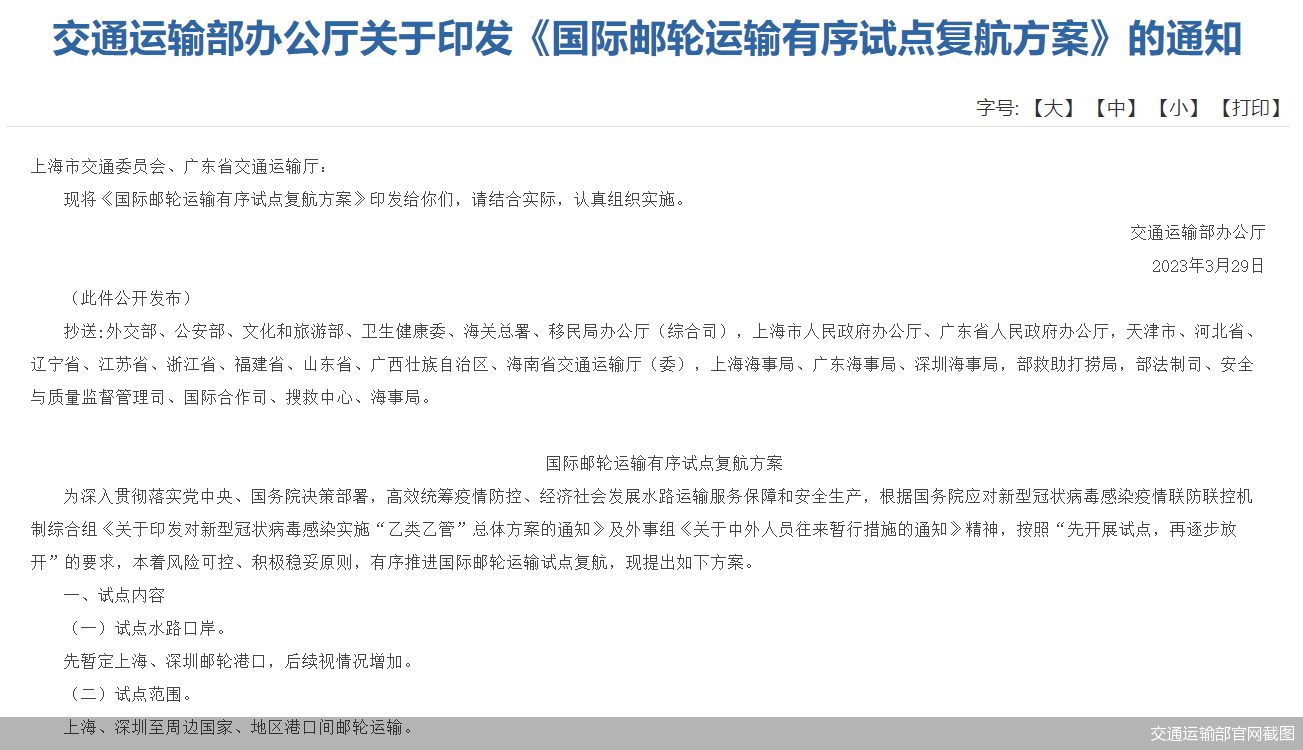 邮轮市场再迎政策春风。3月30日,交通运输部办公厅印发关于《国际邮轮运输有序试点复航方案》(以下简称《方案》)的通知,针对试点水路口岸、试点范围以及试点条件等进行明确。其中指出,先暂定试点恢复上海、深圳邮轮港口,后续视情况增加。利好政策的发布,也让各国际邮轮企业闻风而动,重新谋划布局中国市场。不过新船调入以及航线调整都需要时间,业内预计整体邮轮市场恢复仍需6个月到1年左右时间。
