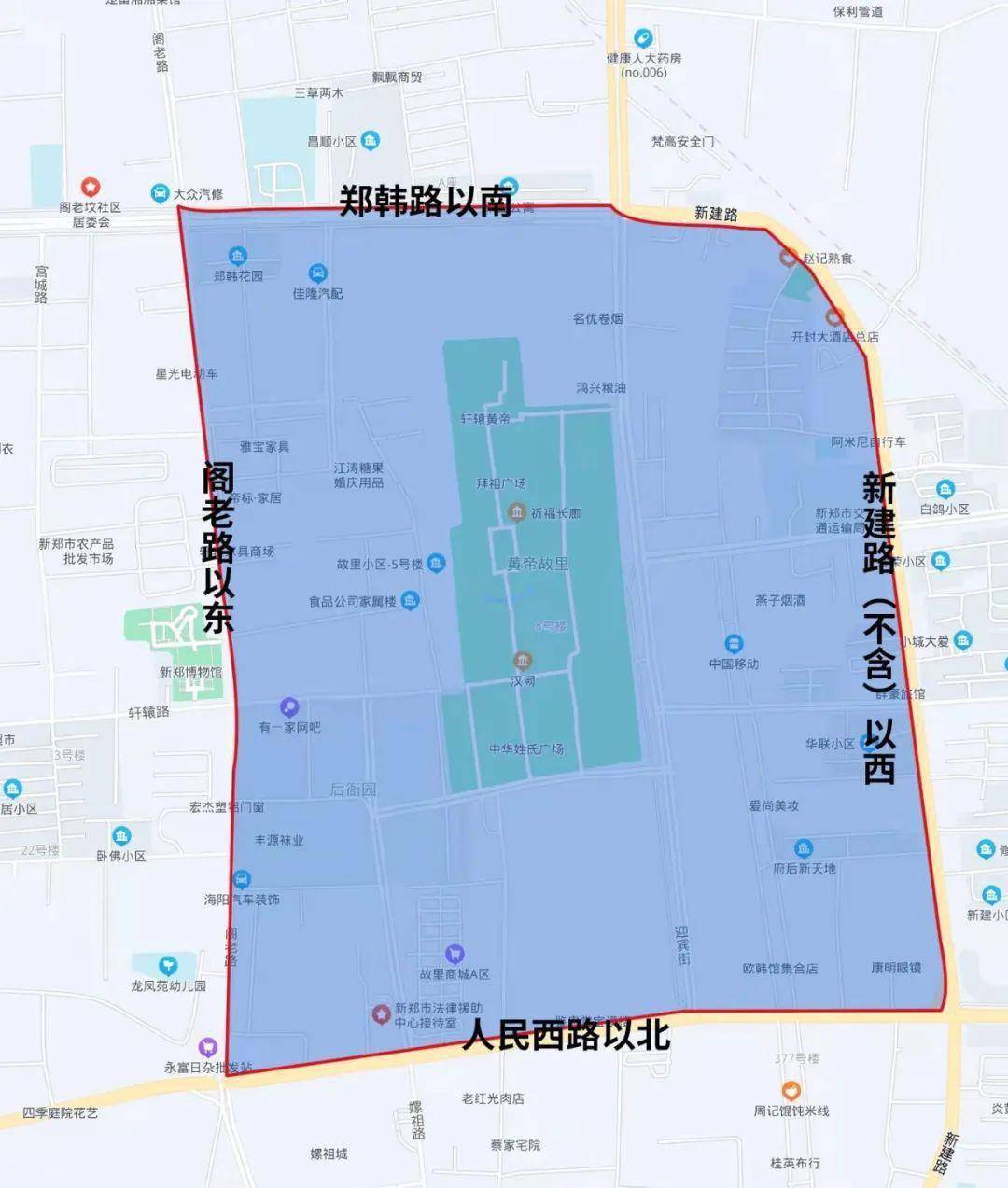 阁老路以东、新建路(不含)以西、郑韩路以南、人民西路以北区域。