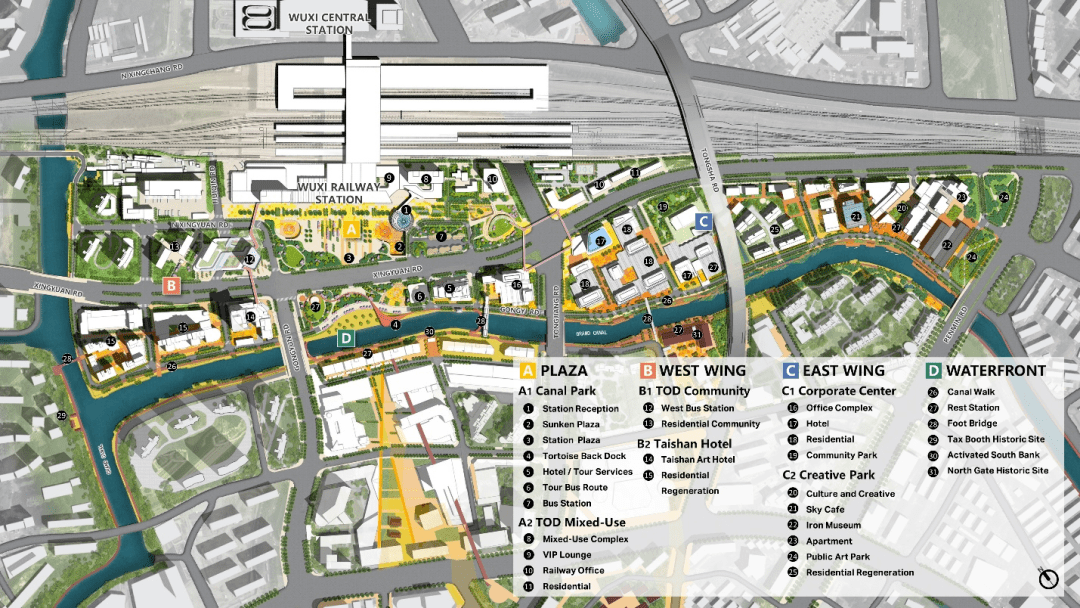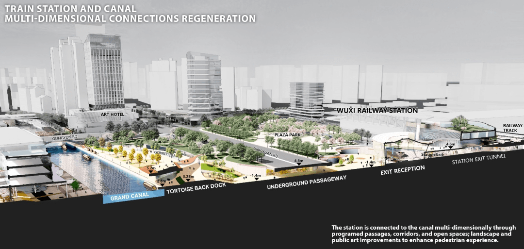 项目旨在打造无锡站南广场区域成为沪宁线文、商、旅、中转融合发展的城市门户区,实现以站营城,站城一体。在场地现状的基础上,项目团队融合城市界面与运河、空间感和城市形象关系的考虑,塑造出功能混合、业态多元的四大片区:一站式商旅服务和市民休闲的铁道运河公园、“商 · 办 · 游 · 居”融于一体的锡澄企业天地、“三创”汇集的工艺文创园、以泰山艺文酒店激活新型滨水前线的泰山艺文水岸。