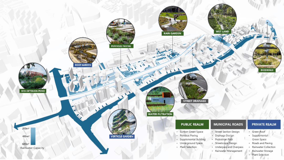 为实现老城的绿色可持续更新发展,项目通过改善公园绿地、市政道路、社区与建筑等多层面基础设施,打造海绵城市系统,实现拟定约55-60%地表径流率目标,减少污染与内涝灾害,以期为区域带来长久活力。