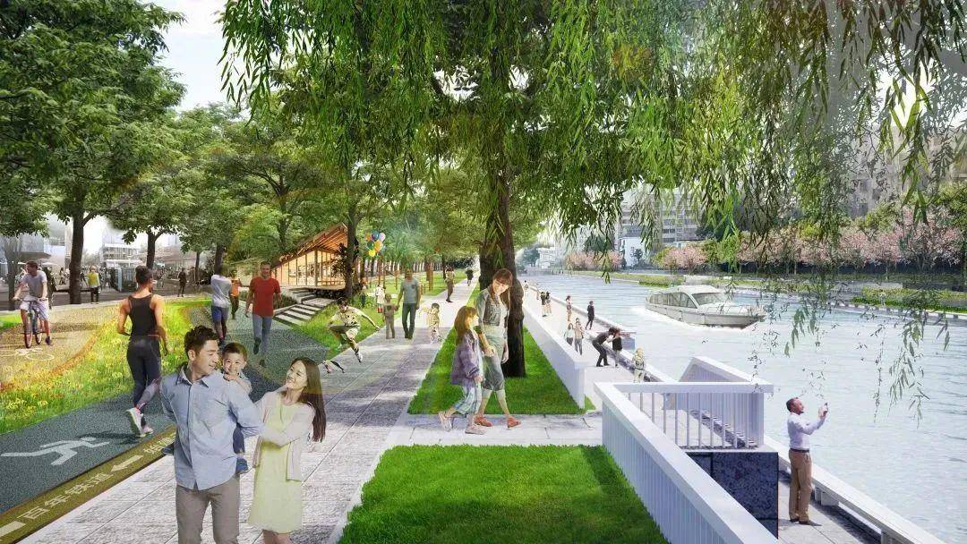 南广场的地面层为近6万平方米的城市公园,并计划对运河两岸现状零散绿地与开放空间实施更新提升,通过一条2公里长的滨水通廊及6个运河驿站,串联打造出运河文旅休闲带,构建可净化、可到达、可感知的运河开放空间系统,以重新建立起运河与城市空间之间的联系。同时,滨河带上漫步道、跑步道、骑行道的三道贯通,将打造活力愉悦、人性化的城市水岸空间。