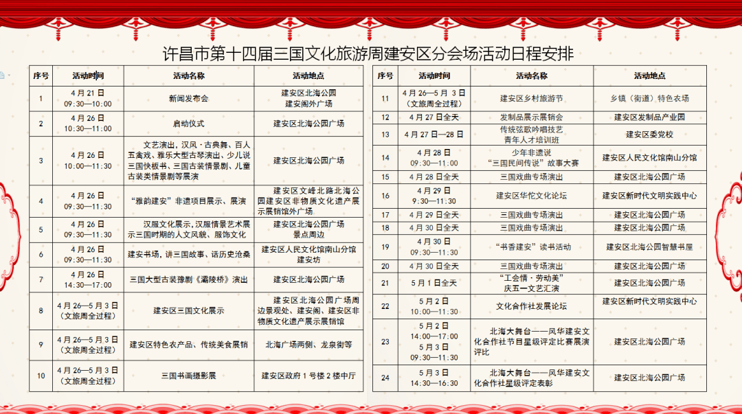 许昌第十四届三国文化旅游周建安区分会场活动由中共建安区委、建安区人民政府共同主办,将于2023年4月26日至5月3日在建安区北海广场举行。本届三国文化旅游周建安区分会场将推出“品三国文化、赏头上时装、游精品路线、促招商消费”四大系列活动。