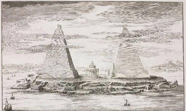 这座迷宫由12个有顶的院落组成,这12个院落分成两排,南北各6个,相对而立。一堵高墙将所有院落环绕在内。整个迷宫里共有3000个房间,地上、地下各1500间。地上的房间我亲自进去参观过,我写的都是我亲眼所见的情况。地下的房间是什么样子我只能听别人给我描述了,因为负责看守迷宫的人无论如何也不肯让我进入地下,他解释说下令建造迷宫的法老们的灵柩以及鳄鱼神的棺木都在那里。我只好把我听到的关于地下房间的情况如实地记录下来。我亲眼所见的地上的房间简直是鬼斧神工的杰作……离迷宫不远的莫埃里斯湖更称得上是个奇迹,莫埃里斯湖一看就是一个人工湖,因为在湖中央矗立着两座金字塔。两座金字塔上都有一尊巨型石雕,表现的是一个坐在宝座上的人……